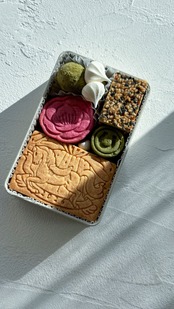 小麦粉(北海道産)、バター、グラニュー糖、卵、粉糖、アーモンドプードル、きび糖、生クリーム、コーンスターチ、白胡麻、マカダミアナッツ、ホワイトチョコレート、伊勢茶きな粉、ブラウンシュガー、黒胡麻、水あめ、はちみつ、レモン、ココアパウダー、抹茶、ラズベリーパウダー、ビーツ、塩、ベーキングパウダー(膨張剤)/(一部に小麦・乳製品・卵・ナッツを含む)